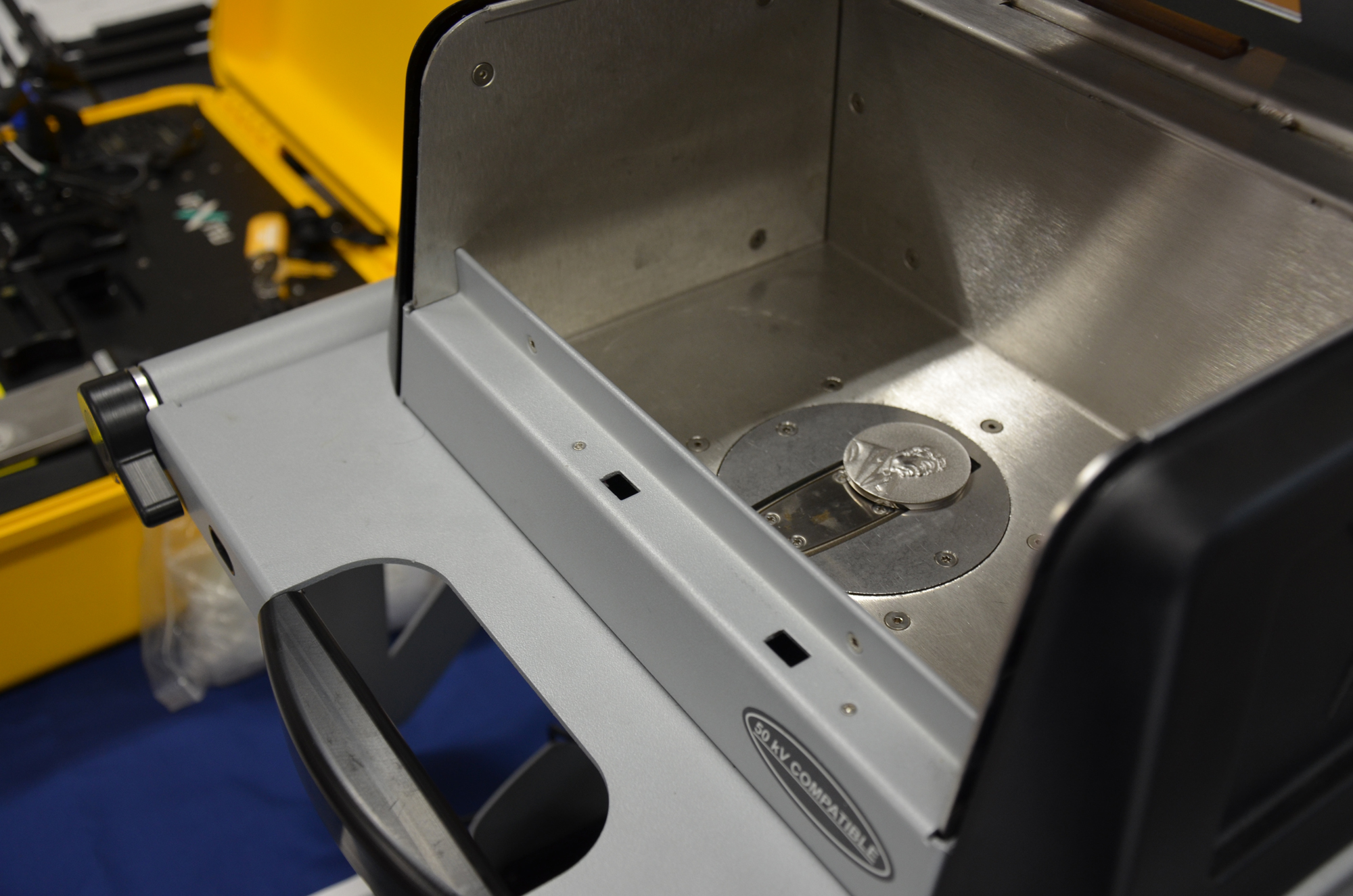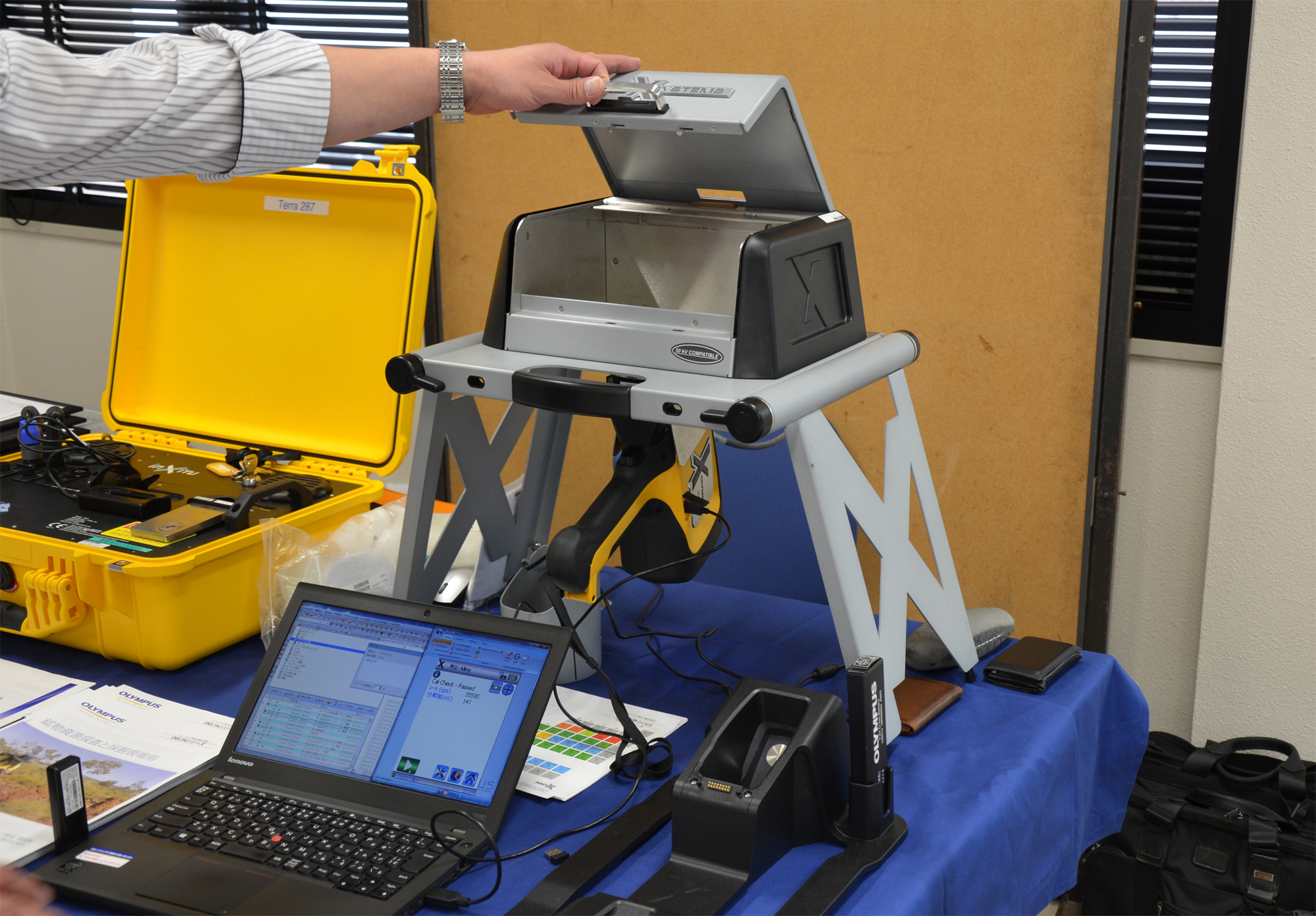 DELTA Premium本体はぶら下がっている黄色い銃型の装置で,普段使いは装置を手持ちでOKです。今回は外乱を防ぐ専用箱オプションを使った。PCでの遠隔操作が可能。