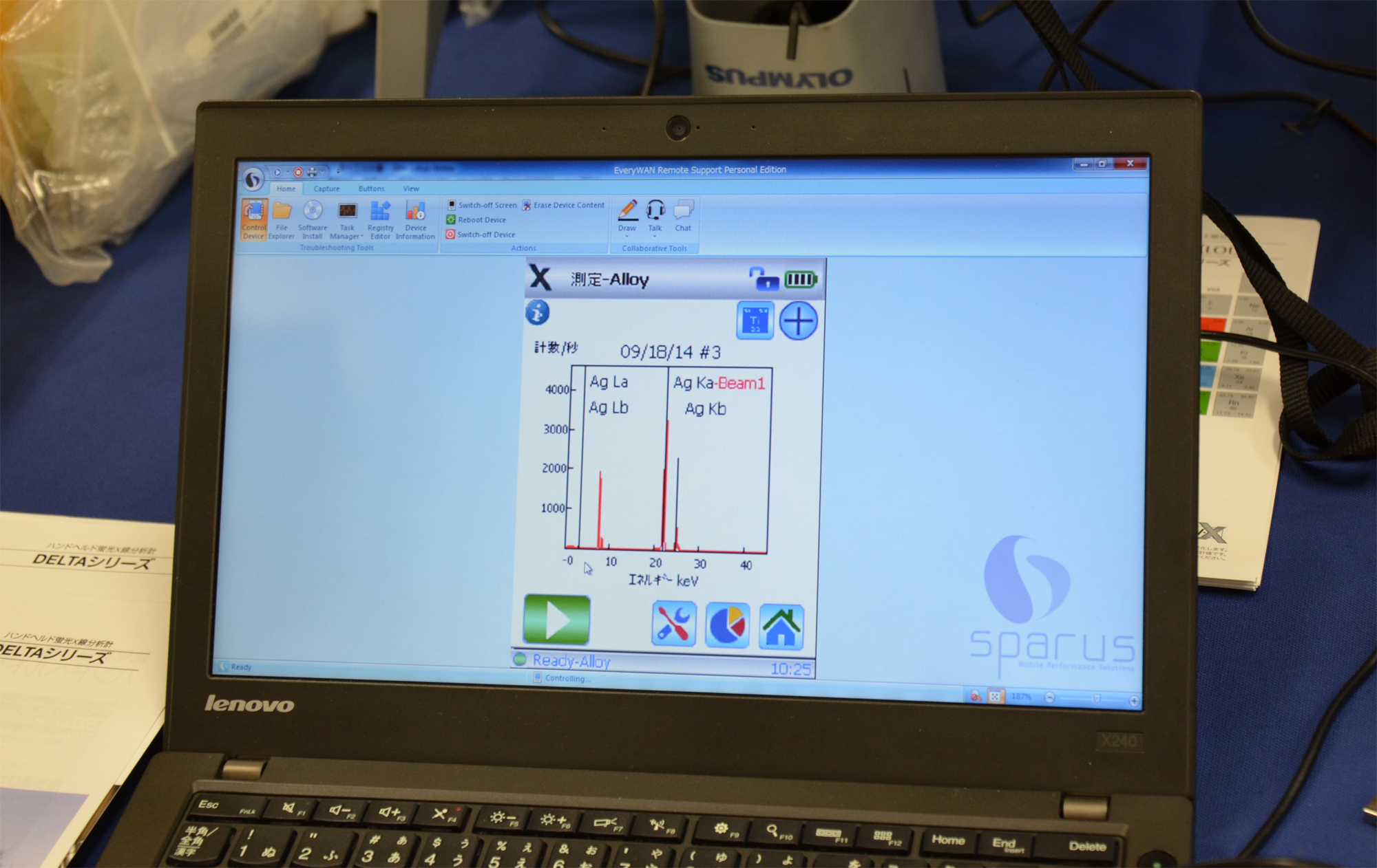 さて,学会では新規ユーザー獲得のために様々な企業がデモブースを開いていることがしばしばあり,鉱物学会にもいくつかの企業が来ています。櫻井賞メダルをネタに旧知の方と「ほんとに純銀か?」なんて冗談をとばしているところでとある企業ブースに目が行く。OLMPUSとアイリス株式会社の共同ブース,そこに置かれているそのブツ,「DELTA Premmium」。こ,こいつは,いちど触ってみたかったハンドヘルド蛍光X線装置ではありませんか。簡単に言うと銃の形をした手持ちの機器で,銃口を目的物に押しつけてトリガーを引けば化学組成がわかるというシロモノです。そして手に持っているのは純銀製とされる櫻井賞メダル。何をしたかおわかりでしょう。サイエンティストたるもの冗談でも出た疑念は解決せねばなるまい!!
