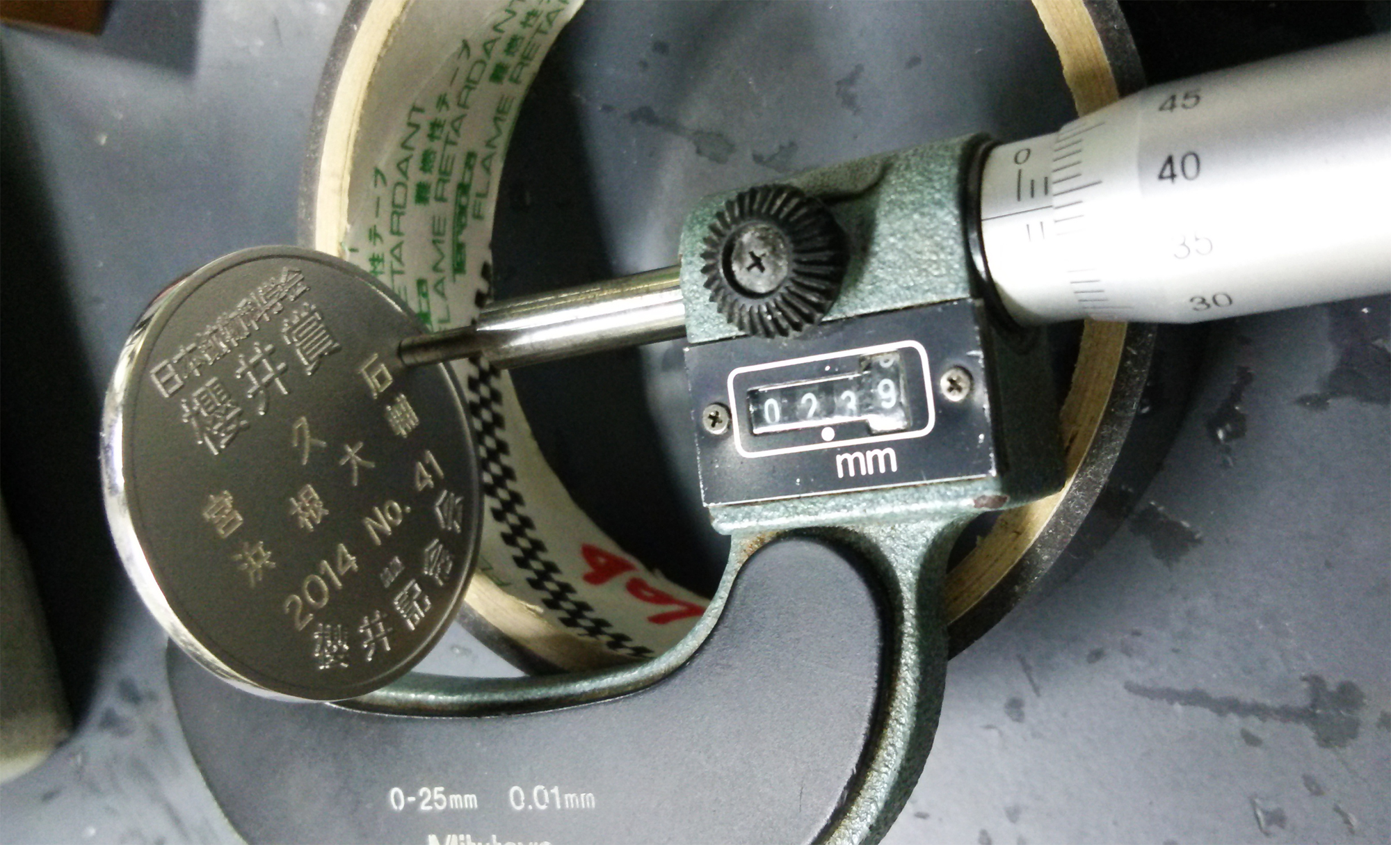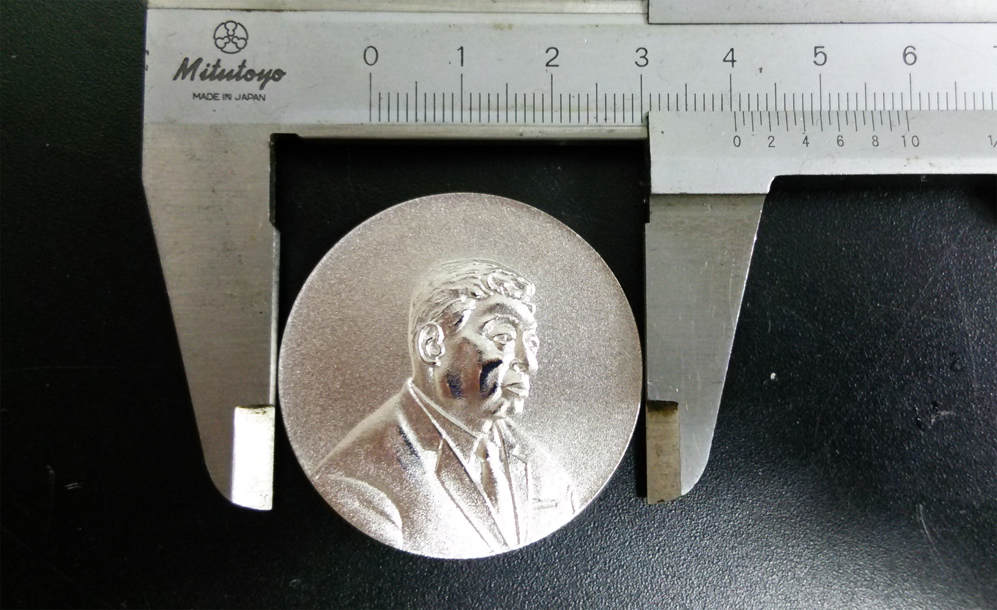 測定してみると密度は重さ/(半径×半径×π×高さ) = 33/(2×2×3.14×0.24) = 10.95g/cm^3となりました。高さをやや少なめに平均しているのでまあこんなものか。この値は銀の密度(10.49 g/cm^3)に近いです。ニッケルの密度は8.98 g/cm^3。もしメダルの厚みが2.7ミリ平均なら9.73 g/cm^3で,これは蛍光分析のAg:Ni=1:1と一致しますが,櫻井先生の肖像以外は厚さが2.5ミリを上回ることはないので,おそらくは平均2.7ミリはありえないでしょう。と言うことでニッケルはメッキと思われます。